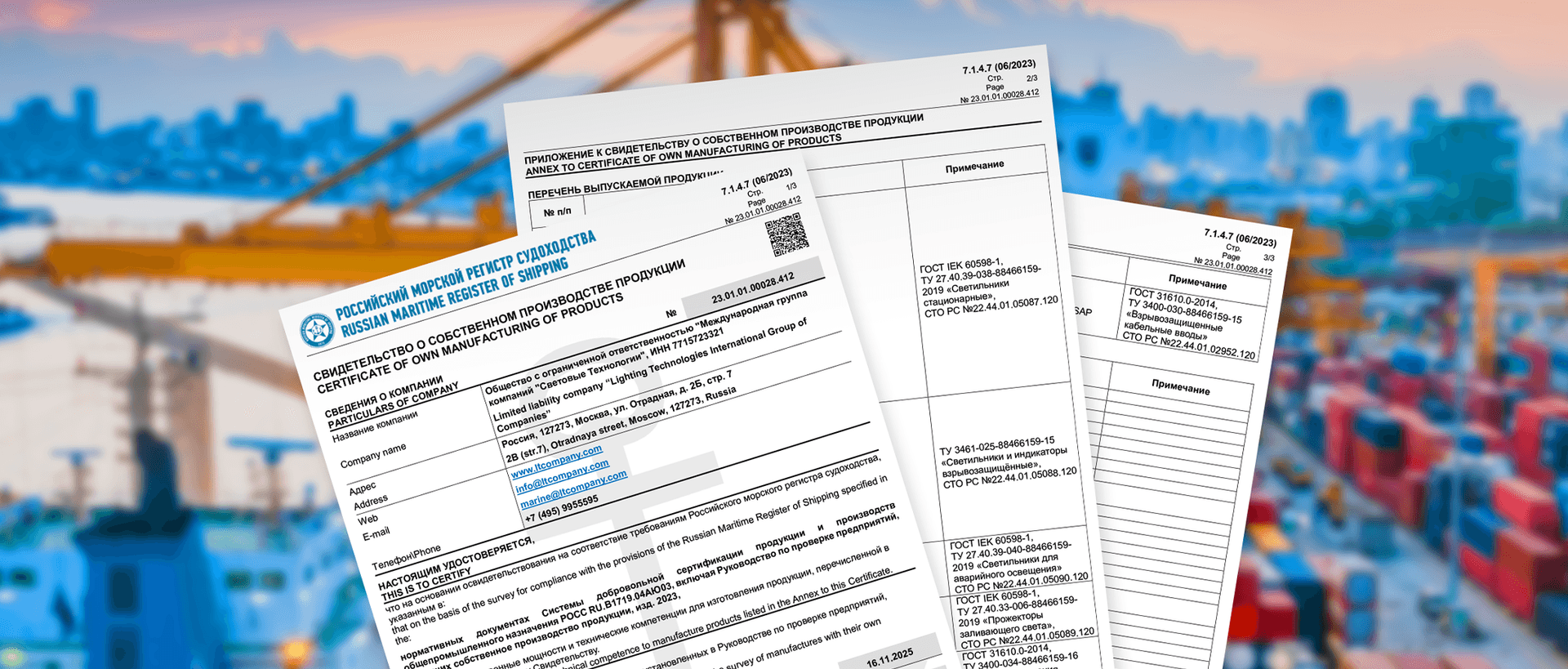 The Lighting Technologies company received a Certificate of its own production of products from the Russian Maritime Register of Shipping!