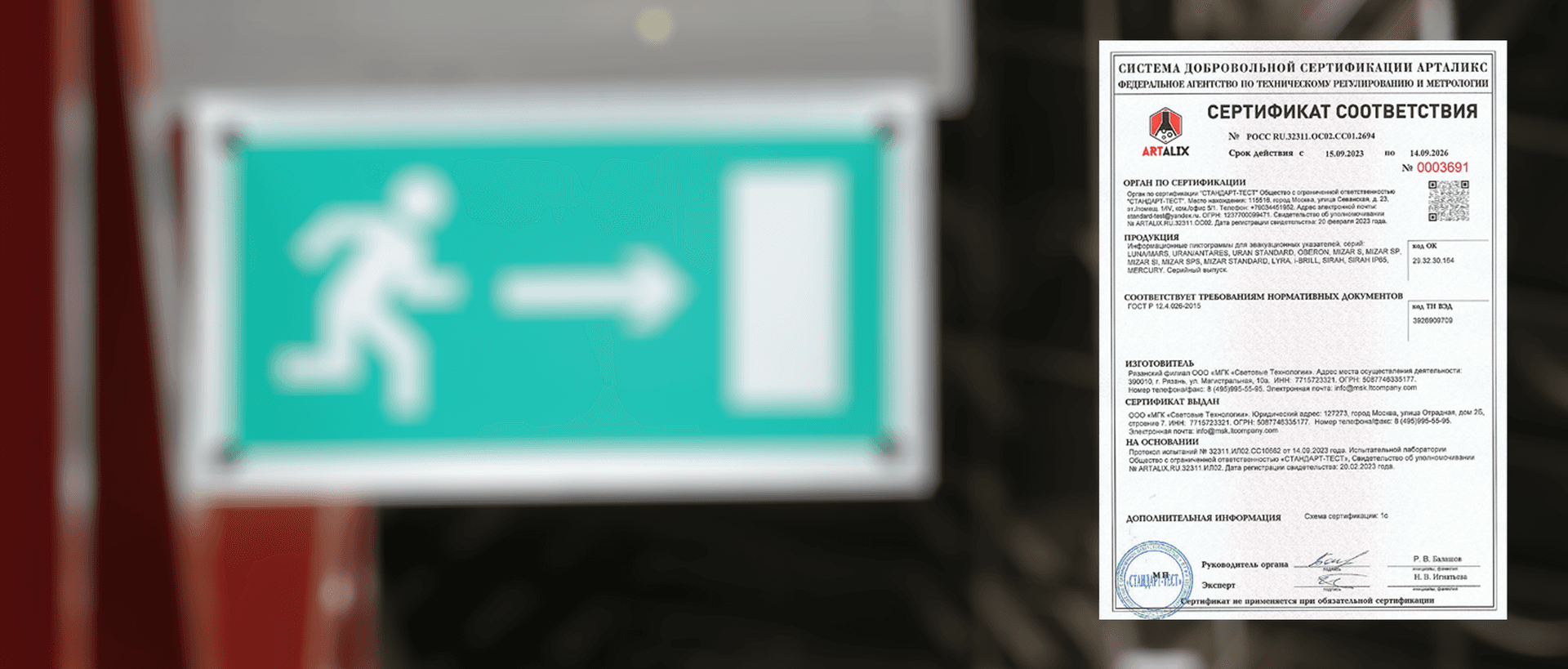 Навигация, обеспечиваемая световыми указателями - это часть системы оповещения и управления эвакуацией людей в чрезвычайных обстоятельствах. Эвакуационные пиктограммы для аварийных светильников должны соответствовать требованиям ГОСТ 12.4.026-2015. Подтверждающий добровольный сертификат соответствия был получен компанией Световые Технологии в сентябре 2023 г.
