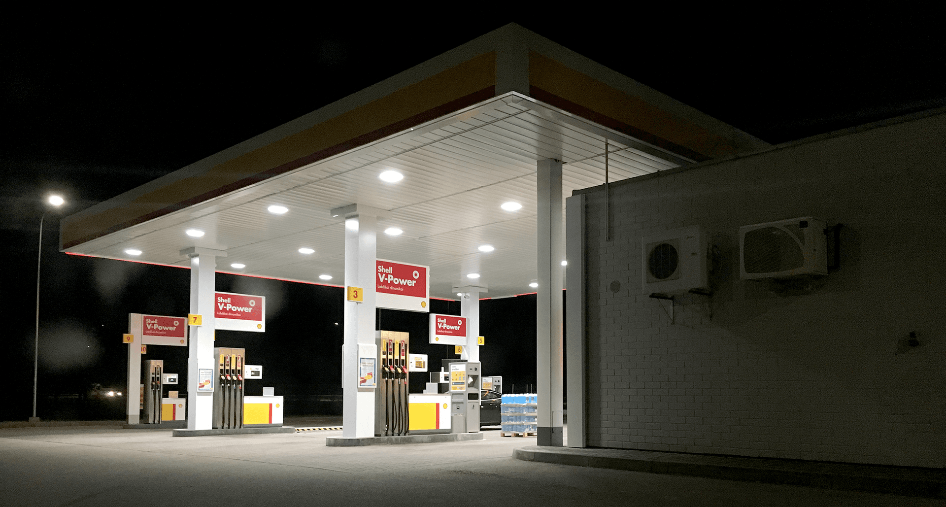 На АЗС SHELL установлены управляемые модификации светильников INSEL LB/R LED со встроенным датчиком движения. При отсутствии автомобилей и людей в зоне ТРК светильники работают в дежурном режиме. При подъезде автомобиля к ТРК светильники включаются на 100% номинальную мощность, обеспечивая высокий уровень освещенности.