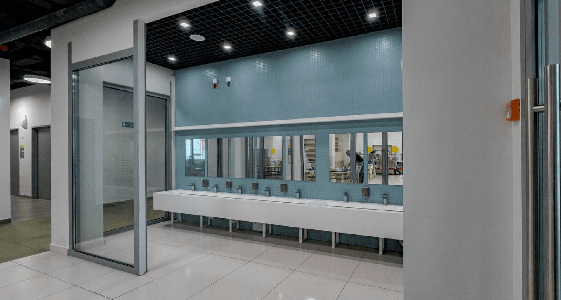 были применены светильники, удачно дополнившие минималистичный дизайн школы и хорошо зарекомендовавшие себя во многих других образовательных учреждениях. В зоне раздевалки реализовано дизайн-решение на базе стандартных светильников PROFILE, расположенных в виде имитации кроны дерева.