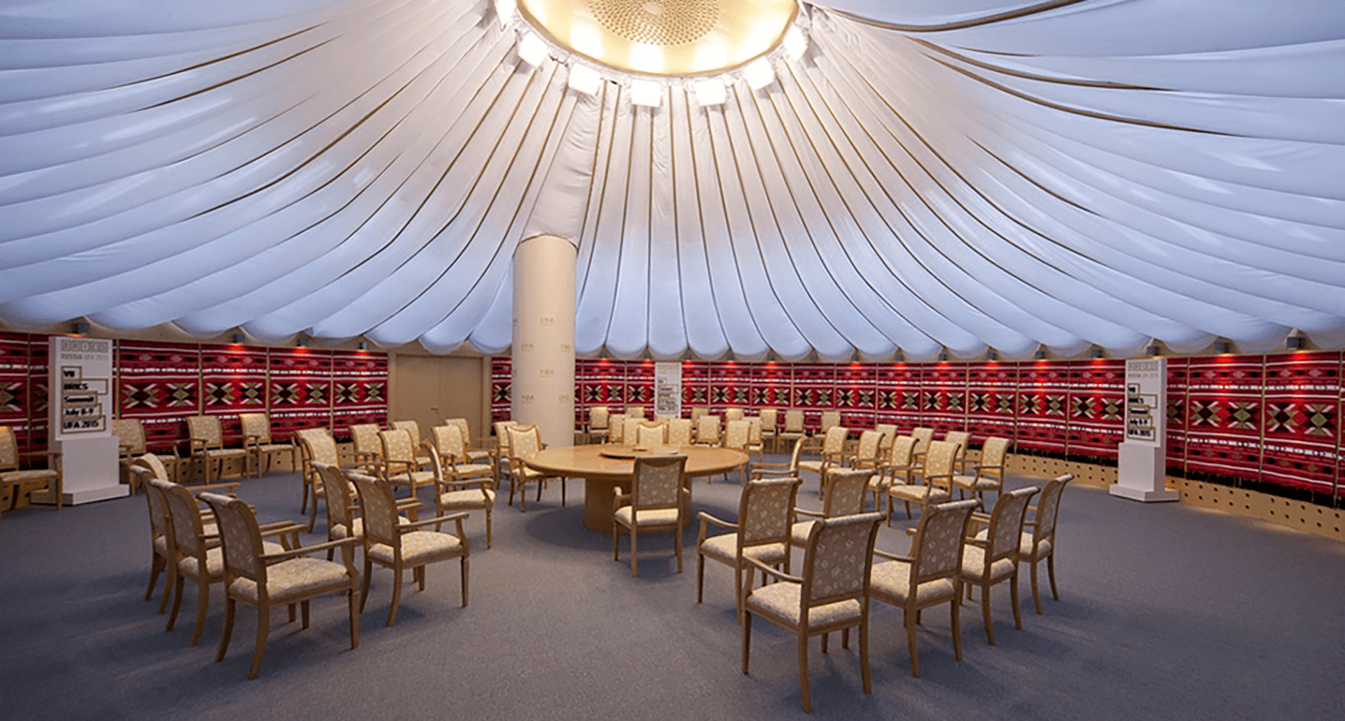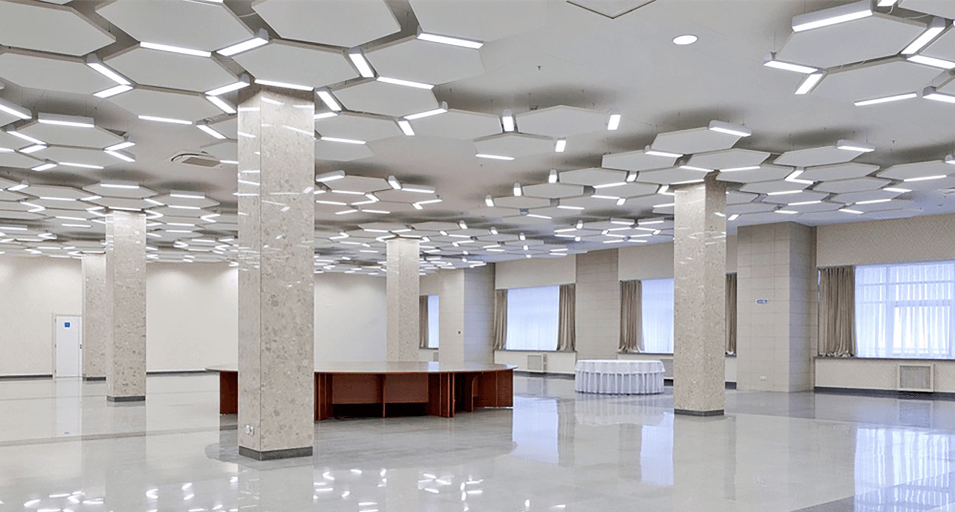 В связи с комплексной реконструкцией здания в преддверие саммитов стояла задача спроектировать и заменить освещение в соответствии с дизайн-концепцией. Работа велась совместно с архитектурной студией и при непосредственном участии офиса главного архитектора Республики Башкортостан. Дизайн потолка в конференц-зале и ряде других помещений представляет орнамент с шестигранниками, куда было необходимо вписать светильники. Поэтому основным здесь было подобрать светильники, которые по размерам соответствовали бы боковой грани фигуры.