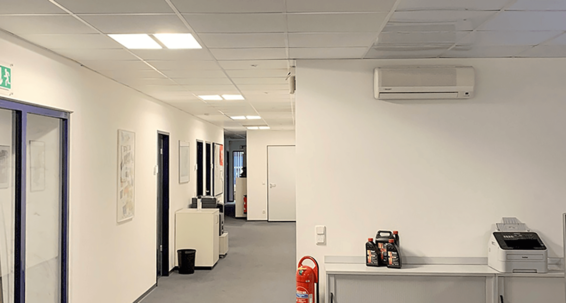 в офисе применены серии PIXEL LED и OPTIMA ECO LED, которые обеспечивают комфортное освещение рабочих зон с нужной интенсивностью света. В коридорах установлены RKL LED и OTX LED.