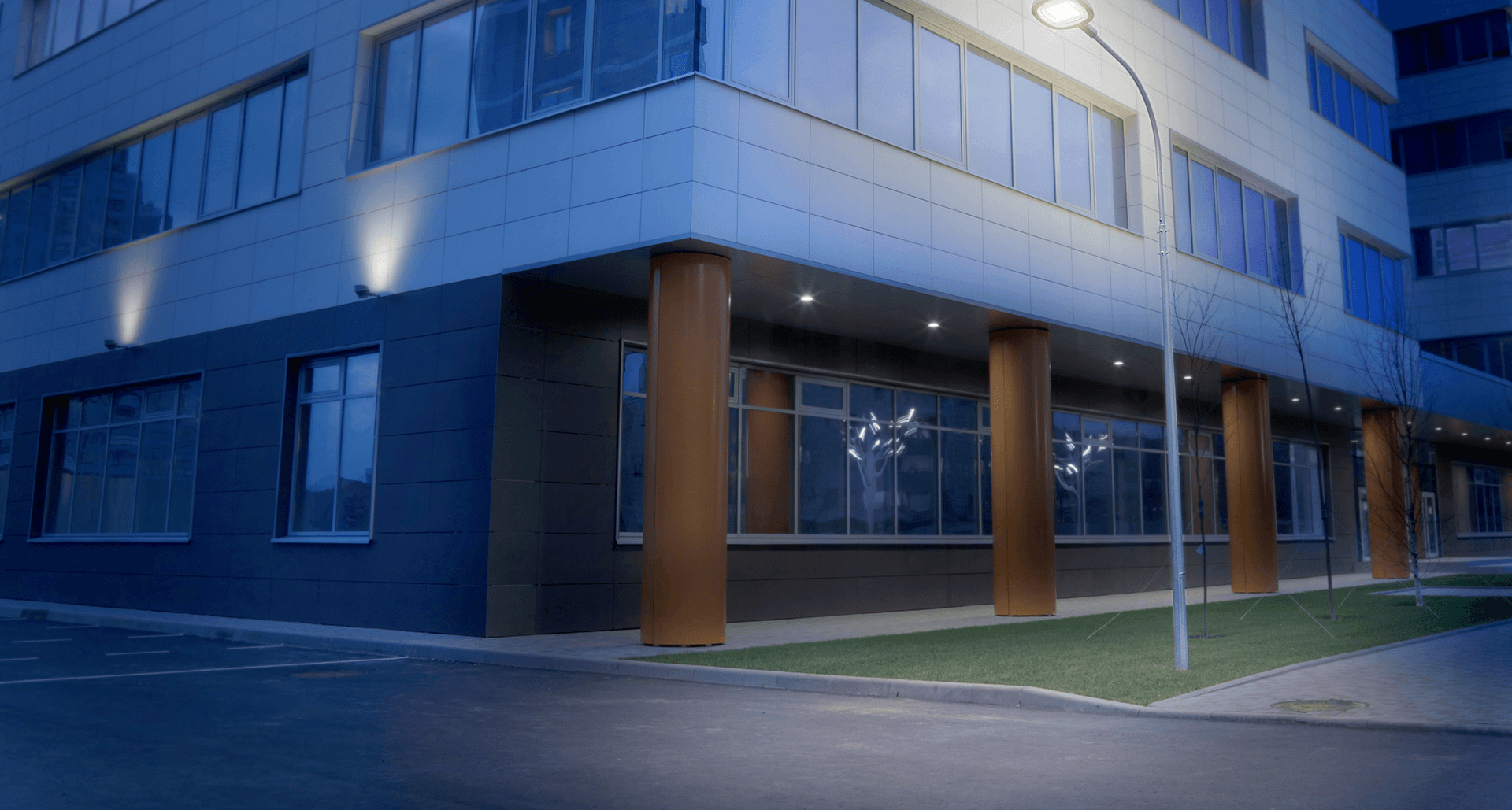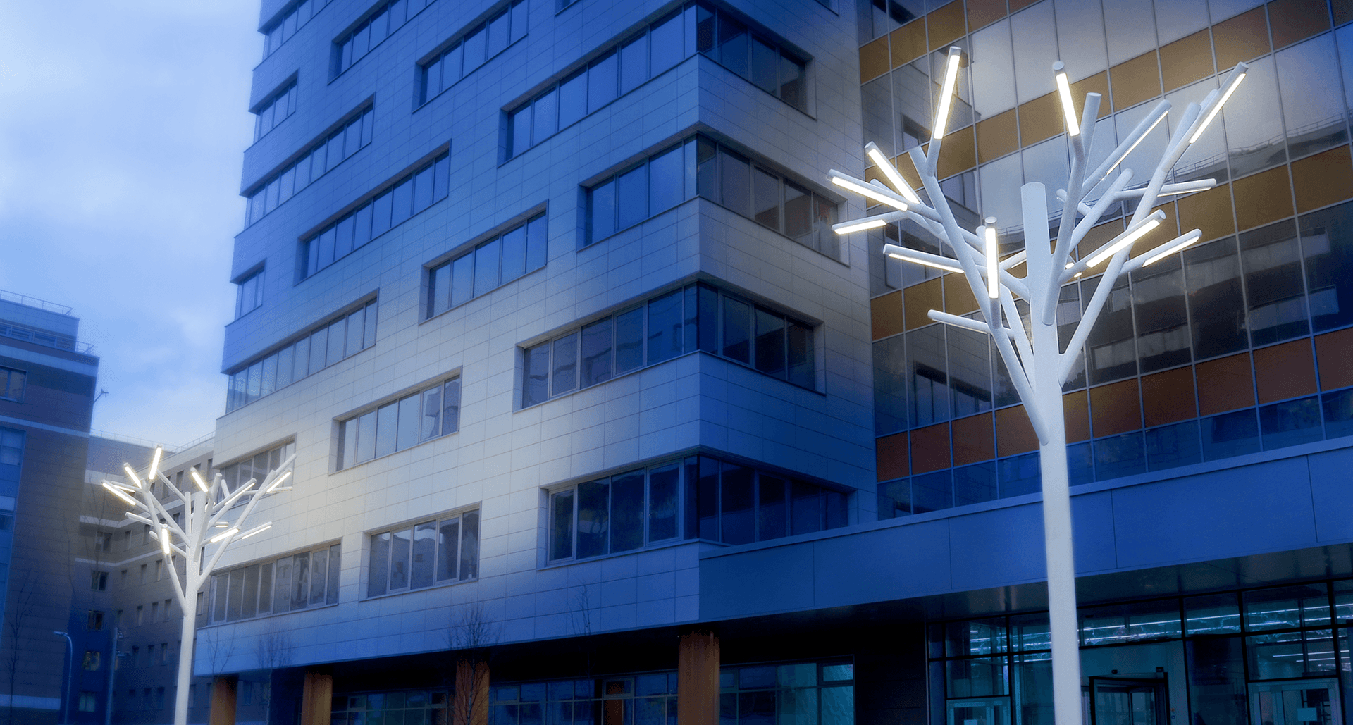 Реализовать световые решения для освещения прилегающей территории офисных зданий, в которых сочетаются критерии современного дизайна, надежности и эффективности.