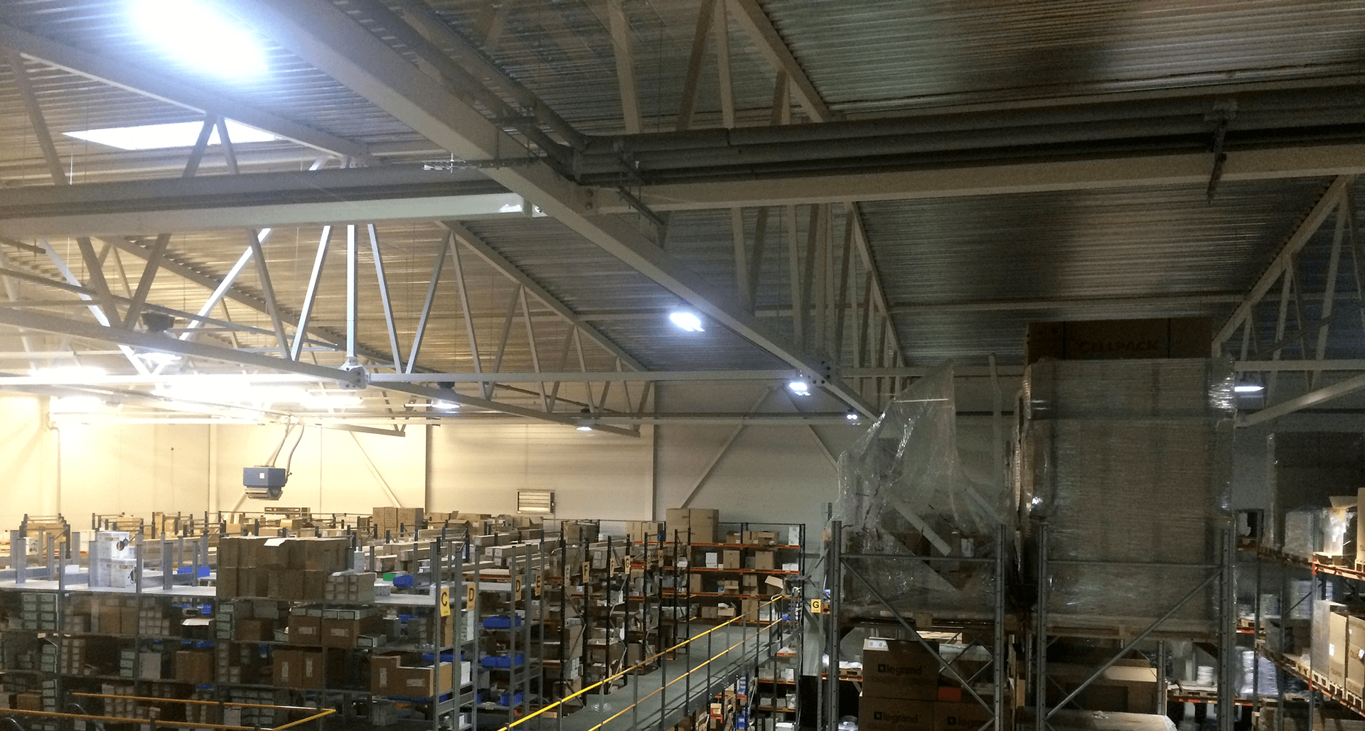 Светильники производства компании «Световые Технологии» установлены на одном из рядов стеллажей на складе. Все преимущества светодиодного освещения для складских помещений хорошо видны в сравнении со светильниками с традиционными источниками света, которые установлены на других линиях.