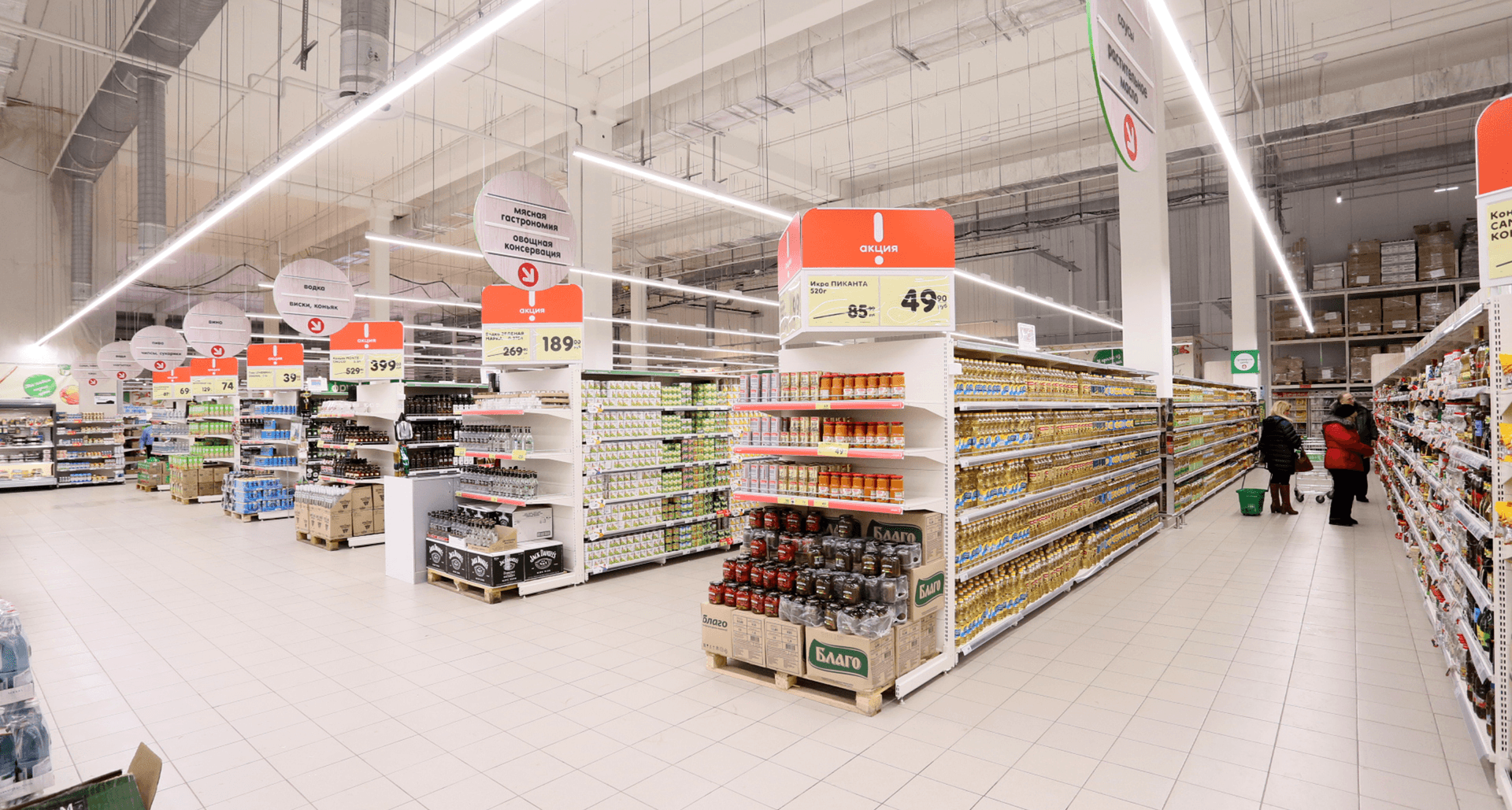 Заказчик поставил задачу заменить устаревшее освещение в нескольких гипермаркетах на светодиодное до конца 2016 года. Это касается всех зон освещения – от основного света до акцентного. Наше решение должно было удовлетворять строгим требованиям заказчика, обеспечивать не только высокую общую освещенность, но и равномерность освещения товара на всех уровнях стеллажей и полок. Уменьшение затрат на электроэнергию и эксплуатационные расходы – еще одна важная задача со стороны клиента.