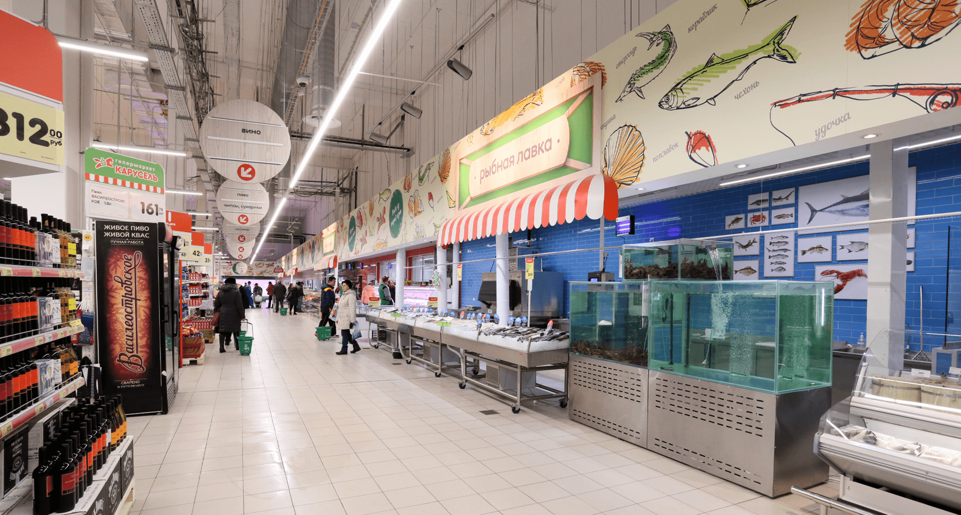 Под требования заказчика были разработаны специальные световые приборы. Во всех торговых помещениях установлено светодиодное оборудование производства компании «Световые Технологии». Основное освещение обеспечивают светильники XLINE, освещение стеллажей – PROFILE. Акцентному освещению было уделено особое внимание, оно выполнено на JET, FLIP, DL TURN с разными цветовыми температурами и специальным спектром для каждого типа продуктов. Установленное оборудование полностью соответствует техническому заданию заказчика, а также позволяет снизить энергопотребление практически в два раза. Проект реализован в сотрудничестве с Инженерным центром «Европейская Электротехника». Совместная работа велась от разработки проектного решения до поставки оборудования и шеф-монтажа.
