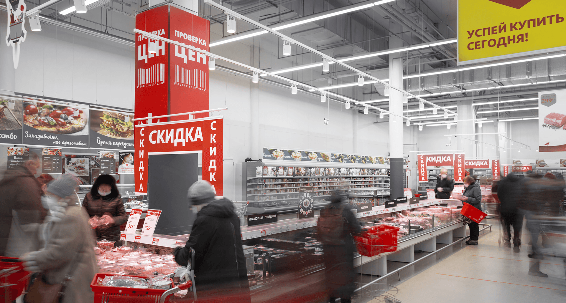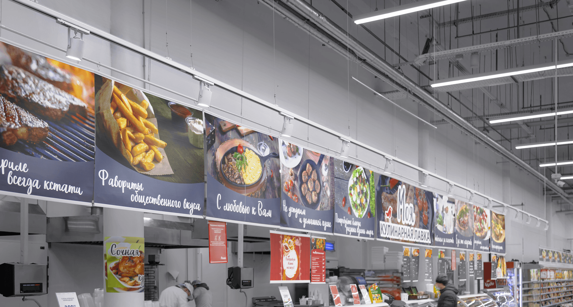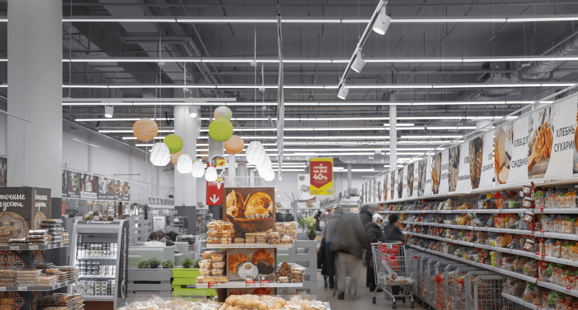 Гипермаркеты АШАН - всем знакомый формат покупок для всей семьи. Магазины сети отличаются большими площадями и широким разнообразием товаров. Перед нами была поставлена задача проработать зоны акцентирования - мясной отдел, отдел с фруктами и овощами, а также осветить стеллажи со свежей выпечкой. Для заказчика было важно сакцентировать внимание покупателей на отдельных группах товаров с использовнием трековых систем, чтобы в процессе эксплуатации оставалась возможность изменения положения световых приборов в пространстве.