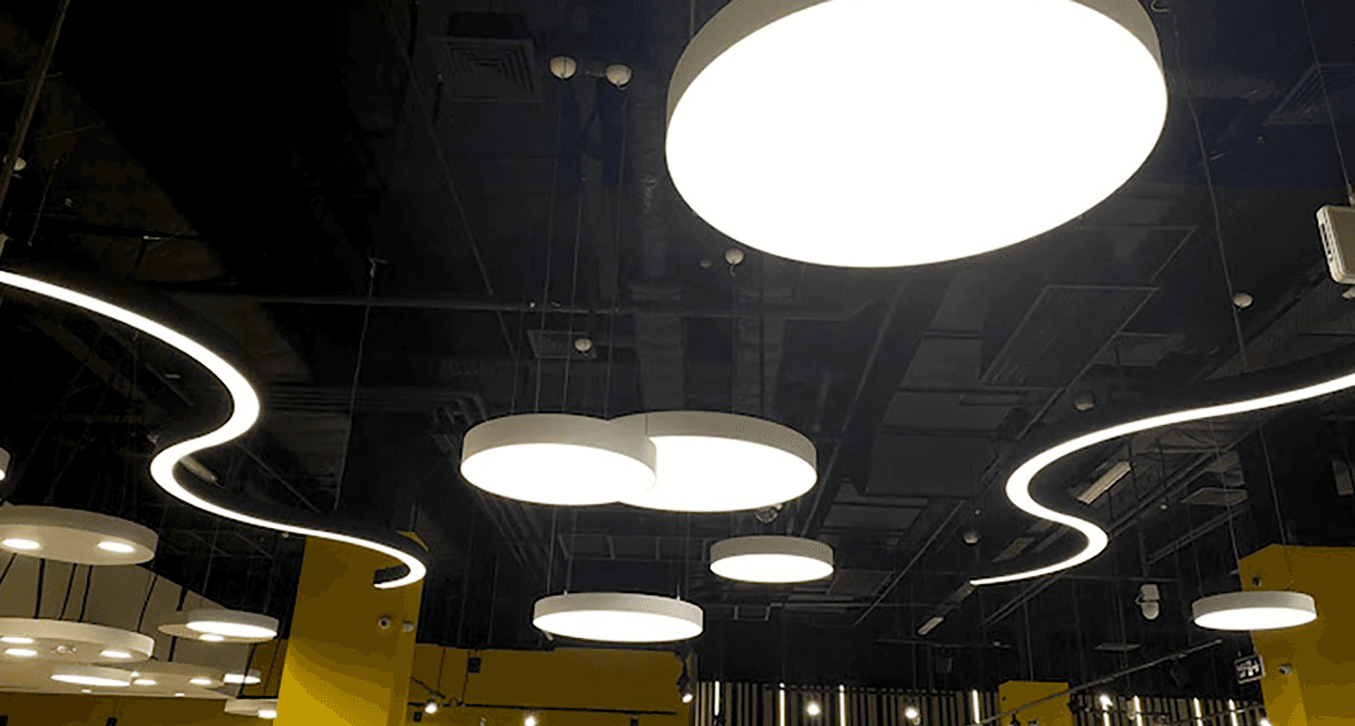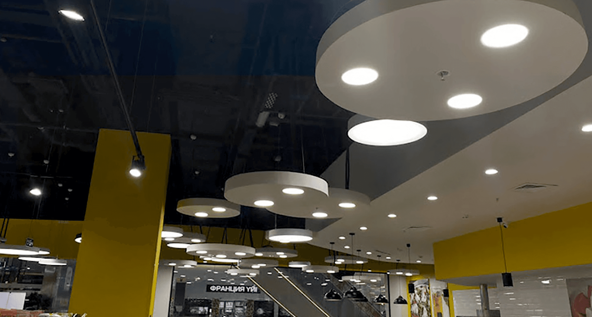 Общее освещение в торговом зале реализовано с помощью светодиодных светильников необычных форм - равнояркие подвесные круги - SOL LED, изогнутые линии в форме волны - проектная модификация CYCLE LED. Нестандартные по форме световые решения позволили добиться нормируемых показателей освещенности, при этом подчеркивая высокий статус продуктовой сети. Зоны акцентирования выполнены с использованием серии ARMA/T.