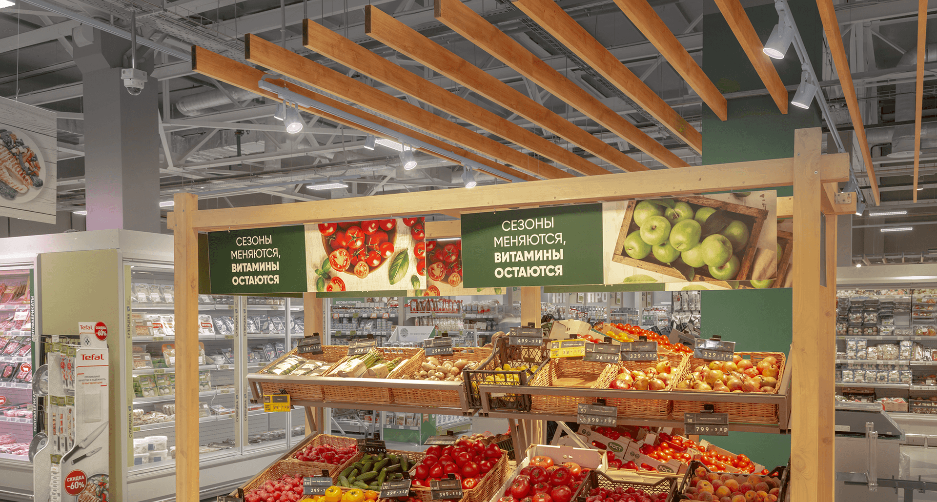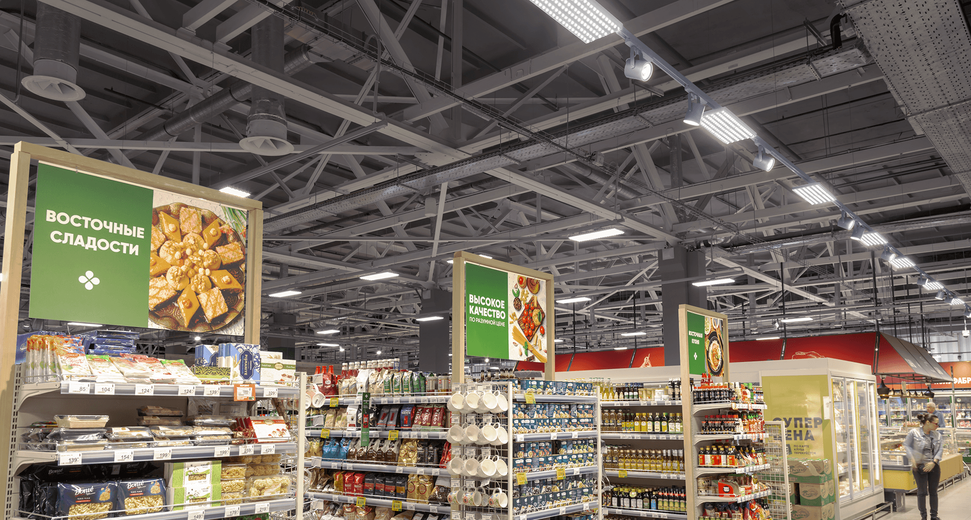 Под магазины сети разработан концепт-план освещения всех зон торговой площади с испоьзовнием световых пиборов LT. Для освещения зон касс и проходов использовались трековые светодиодные панели DOMINO LED PANEL/T с оптикой собственного производства: D90 и двойной ассиметричной . Зоны акцентирования освещены с помощью светильников ARMA/T. Спектральные арактеристики световых приборов выбирались с учетом особенностей товарных групп: для зоны овощей и фруктов использовалась КЦТ 3000К с индексом цветопередачи >90, для освещения зоны выпечки была выбрана КЦТ 2700К, мясной отдел освещался световыми приборами со специальным спектром с пиком в красной области, чтобы сделать акцент на свежести красного мяса.Слаженная работа команды LT принесла свет в десятки магазинов сети. Обратите внимание на освещение, когда в следующий раз отправитесь за покупками.