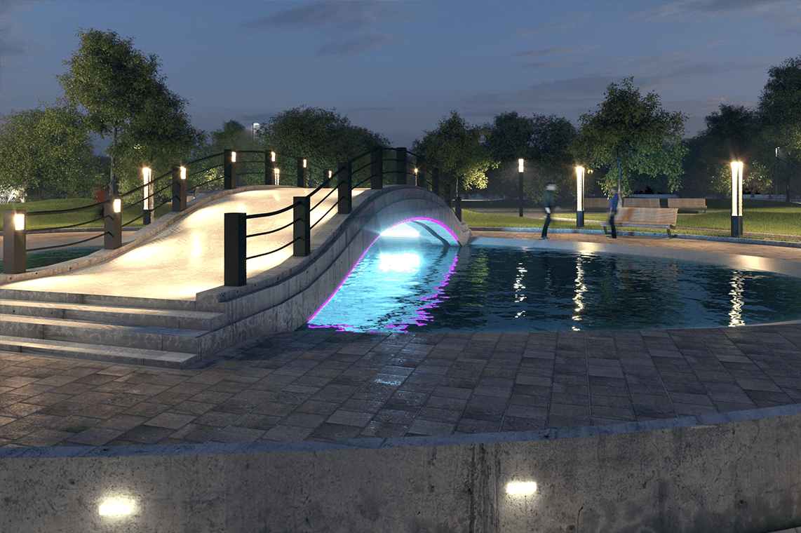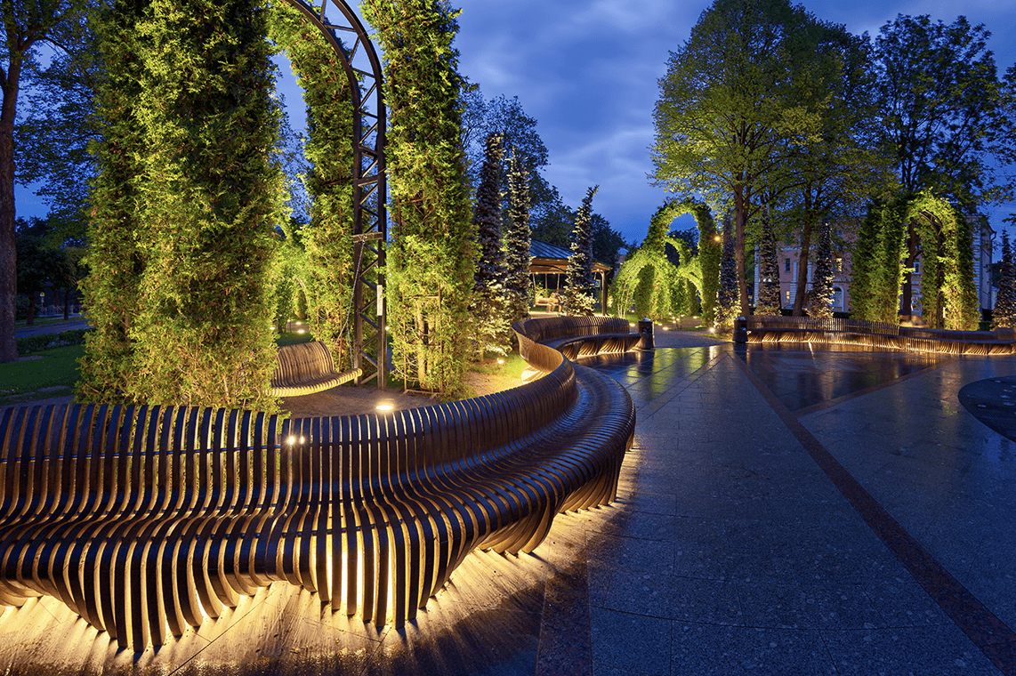 Малые архитектурные формы (МАФы) - это скамейки, беседки, ротонды, скульптуры и прочие подобные объекты, находящиеся на территории парка. Интеграция света в МАФы позволяет сочетать функциональный и эстетический аспекты, а также сокращает количество световых приборов, которые необходимо установить для достижения требуемого уровня освещенности.