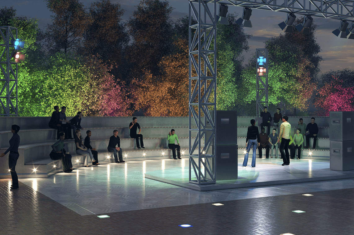 Открытые театры или кинотеатры - это именно та зона парка, которая вызывает у людей особый интерес. Удовольствие от просмотра фильмов или театральной постановки на открытом воздухе только возрастает. Равномерное освещение и мягкий свет в зоне, предназначенной для зрителей, создает необычный элемент декорирования, за счет чего повышается привлекательность открытого кинотеатра, а также появляется подходящее настроение для просмотра кинофильмов. Дополнительное освещение этой зоны также помогает безопасному перемещению посетителей к своим местам, что является немаловажным аспектом.
