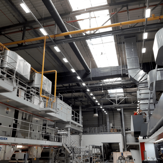 Как правило, помещения БДМ являются многоуровневыми. На верхнем уровне располагается машзал, в котором находится прокатно-сушильная машина. Светильники монтируются на балках либо встраиваются в подшивные потолки. Наличие подшивных потолков является дополнительной сложностью при выборе осветительного оборудования, так как данный тип потолочной системы накладывает ограничения на вес и способ установки светильников.
